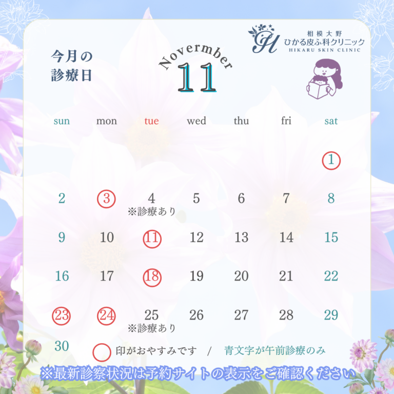 3日(月)祝日・文化の日、23日(日)祝日・勤労感謝の日、24日(月)振替休日で休診、振替で25日(火)は1日通常診療を行います。